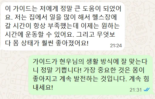 가이드와 계획을 통해 몸과 건강의 실제 변화를 경험하게 됩니다. 더 많은 에너지, 더 좋은 체력, 더 탄탄한 몸을 느낄 수 있습니다.